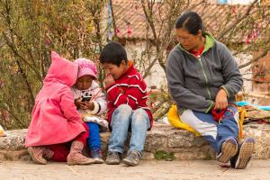 Imagen: Woman sitting with her children playing with a phone in rural Peru. Credit: nmessana/iStock